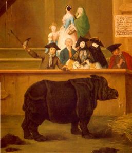 L’«elegante pubblico» non guarda affatto «a bocca aperta» l’animale. Dei nove esemplari umani rappresentati, sette guardano molto al di sopra del rinoceronte, e precisamente verso il pittore che li sta riprendendo, modelli in posa davanti all’obiettivo come se già si specchiassero nel quadro. Dal loro sguardo fisso non traspare nessuna curiosità per l’insolito, esotico animale, anzi nessun sentimento, tranne la preoccupazione di dare un’immagine di sé conforme al proprio rango sociale. Il rinoceronte, opaca massa scura, è collocato nella zona inferiore della tela, ben al di sotto del gruppo di aggraziati e compiaciuti manichini che si trovano lì solo per presenziare al rito e ai quali nulla importa del rinoceronte, ma di essere rappresentati con il rinoceronte (ai loro piedi).