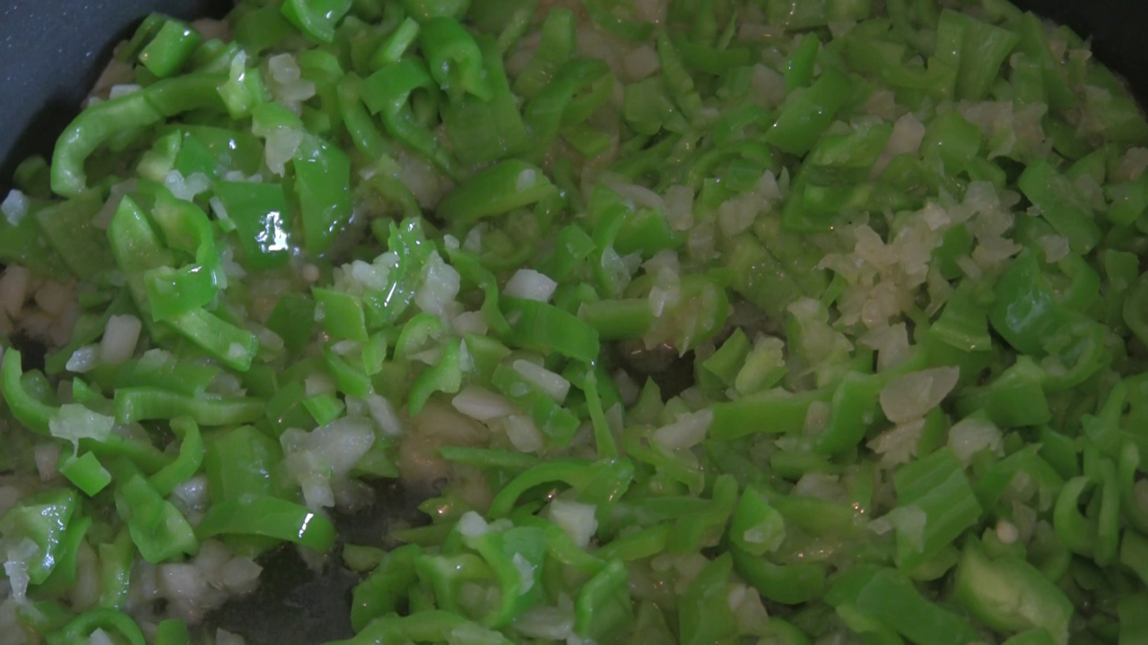 - Ponete in un tegame l’olio con la cipolla e il peperone e fateli appassire.