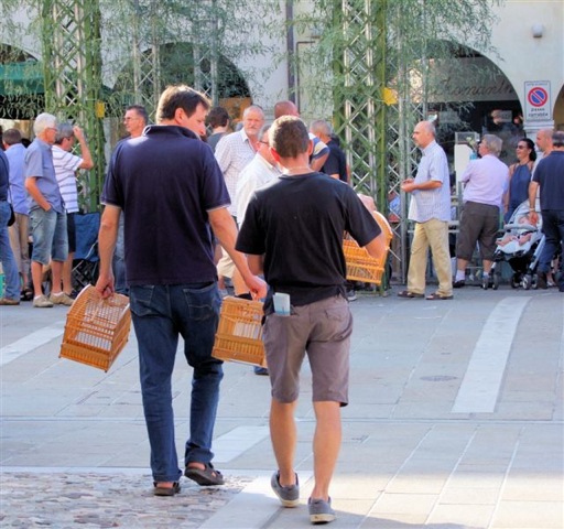 Anche la sagra dei osei in questa dinamica fa la sua parte, parte che sarebbe ingiusto sottovalutare. Questa, come tutte le sagre, è anche luogo di ritrovo e di festa dove portare i bambini, che ne costituiscono di conseguenza pubblico privilegiato. Mettiamoci allora per un po’ dal loro punto di vista, usando quell’empatia di cui anche noi adulti, per quanto deteriorati possiamo essere, non possiamo non conservare traccia: cosa vedono i loro occhi? Vedono “osei”, alias uccelli, uccellini, volatili di ogni specie, grandezza e tipo chiusi dentro gabbie; gabbie numerose, l’una sopra all’altra e l’una di fianco all’altra, a formare un enorme reticolato che separa la vita articolata e ricca del di fuori dalla coercizione e dai limiti del di dentro. Vedono animali variamente stipati, a volte immobili, a volte soggetti a stereotipati nervosi movimenti del capino; vedono bestioline ferite e lasciate lì; altre che si indovinano collassate dal caldo; altre ancora che sbattono infinite volte contro il metallo delle gabbie. Vedono una realtà fatta di reclusione, imprigionamento, isolamento dal contesto naturale; di impossibilità a fare quello che gli uccelli per definizione fanno: volare, che è di certo cosa buona e bella, tanto che noi umani gliela invidiamo e in mille modi cerchiamo artificiosamente di riproporla, pur non essendo certo stati attrezzati dalla natura a farlo. E invece no, a loro non glielo facciamo fare: sole, luce, rami da raggiungere, giochi a rincorrersi, amoreggiare e litigare nell’aria, tutto rigorosamente vietato a tutto vantaggio di una stolida carcerazione di loro che sono detenuti senza colpa. Magari vedono, i bambini, anche un prezzo esposto sulla gabbia, tanto per fugare ogni dubbio: noi gli uccelli li vendiamo e li comperiamo, li rinchiudiamo e li spostiamo dove vogliamo.